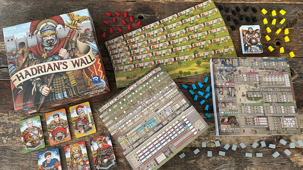 In Hadrian’s Wall, players take on the role of a Roman General, placed in charge of constructing a milecastle and bordering wall. Over 6 years (rounds), players will construct their fort and wall, man the defenses, and attract civilians by building services and providing entertainment – all while defending the honour of the Roman Empire from the waring Picts. The player that can accumulate the most Renown, Piety, Valour, and Discipline, whilst avoiding Disdain, will prove to the Emperor they are the model Roman citizen and be crowned Legatus Legionis!