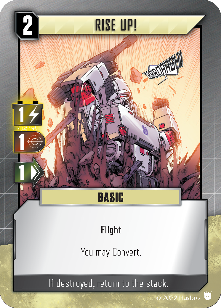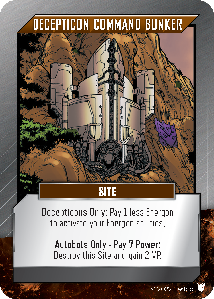 A Rising Darkness includes dozens of new Technology, Maneuver, Site, Relic and Ally cards that you can mix and match with similar cards from the core set to customize your own TvT experience. Among these is a new Basic card, Rise Up, which replaces Roll Out (you can include both in TvT). One card you will always want to include is the Decepticon Command Bunker, a new Site which serves a dual-purpose in TvT: for Decepticons it offers a friendly place to get an Energon discount when activating their abilities, and for Autobots, it provides a tempting target to destroy in order to gain valuable victory points. The team with the most victory points wins, after all! Which cards you decide to include will be a matter of preference, guided in part by what sandbox you want to play in. We hope to give you many more options to customize your game with each new release.