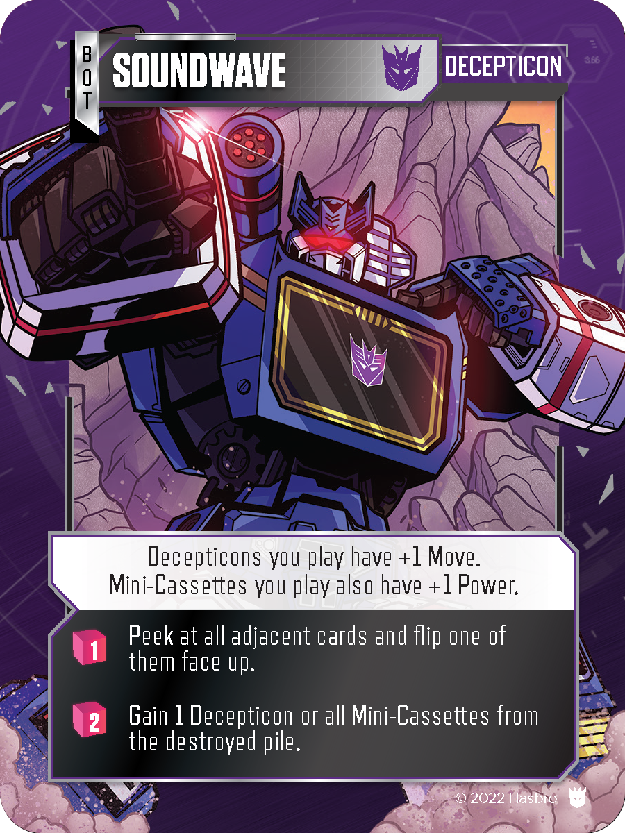 Transformers Deck-Building Game: A Rising Darkness is a standalone game, so even without the core set, you can play both competitive and cooperative modes, just as you could with our first game. Only instead of playing as Autobots, you’ll take to the skies as Starscream to hunt down Bumblebee and his allies, or send out Mini-Cassette troopers as Soundwave to overwhelm any Autobot who gets in your way. There are 6 playable Decepticons to choose from.