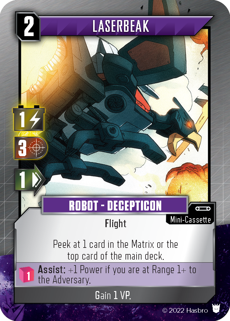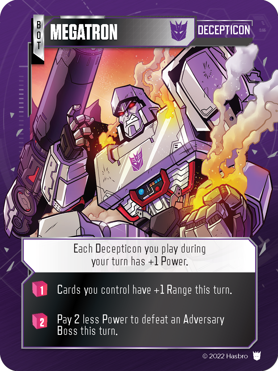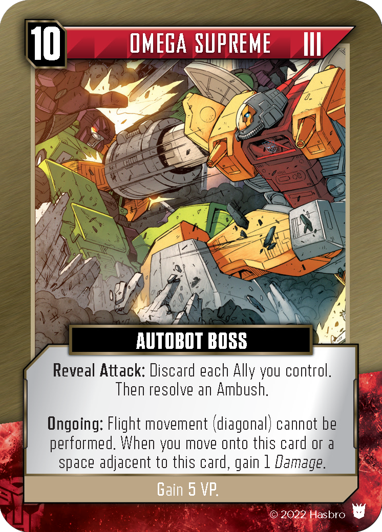 Just like in competitive mode, taking down an Adversary Boss in TvT is one of the best ways to earn victory points, and each faction will be searching for the opposing team’s Bosses in order to confront and defeat them. However, that’s easier said than done, for the opposing team can also play “defensive” Assists, adding their card’s power to the cost to defeat their Boss! For example, if the Decepticons confront Omega Supreme, each Autobot player within Range could play one defensive Assist card the same way Decepticons play regular Assists, and they automatically resolve after the Encounter resolves. So each confrontation can potentially involve all players, giving these battles a more epic feel...and a less certain outcome.
