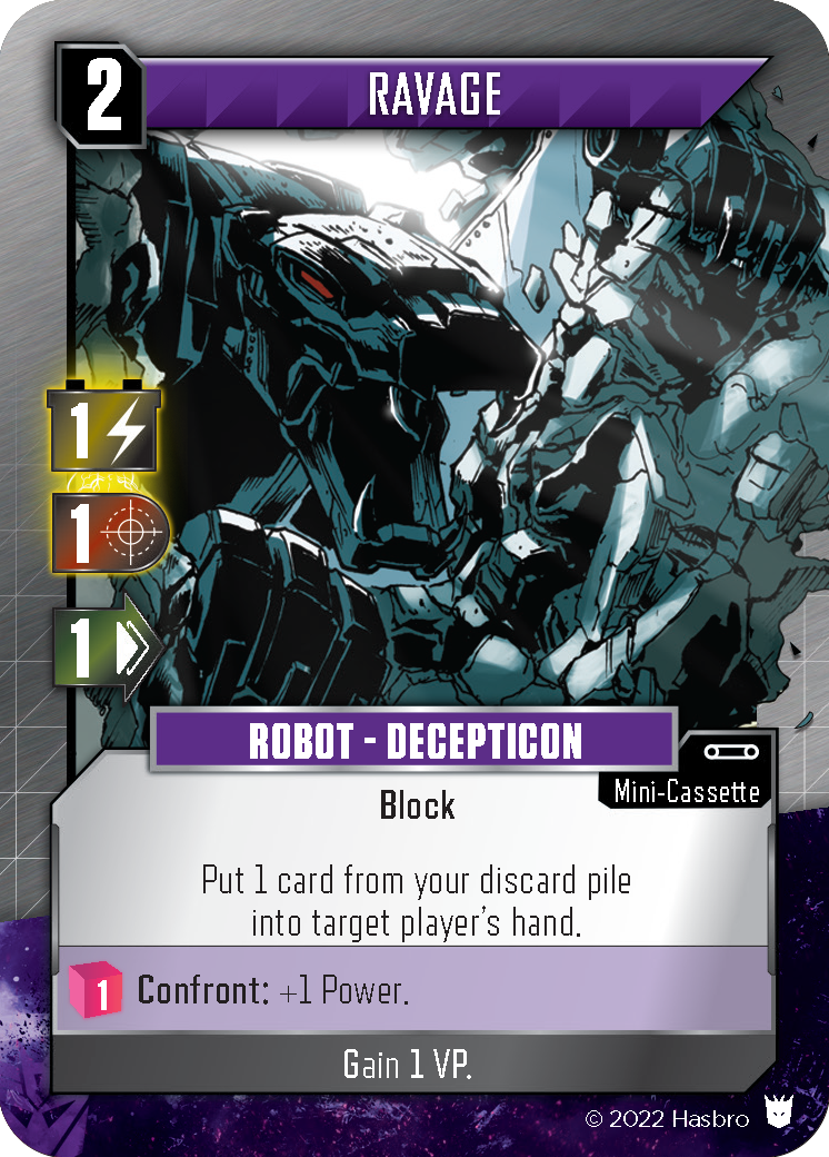 There are more opportunities to affect other players in A Rising Darkness, especially when playing as Decepticons. Damage has greater impact, for one example, and cards that cause players to gain Damage could push the opposing team to a threshold that ends the game. There’s a new Damage card as well: Short Circuit. Unlike standard Damage, this card goes into your discard pile, weakening your hand, and forcing you to play it first during your turn. When you do, it saps some of your Power when battling adversaries. Other cards provide a means to steal Energon or force another player to destroy a card, to name a couple of nasty effects. Many of these cards have the “Attack” keyword, which makes investing in Block cards more important than ever!