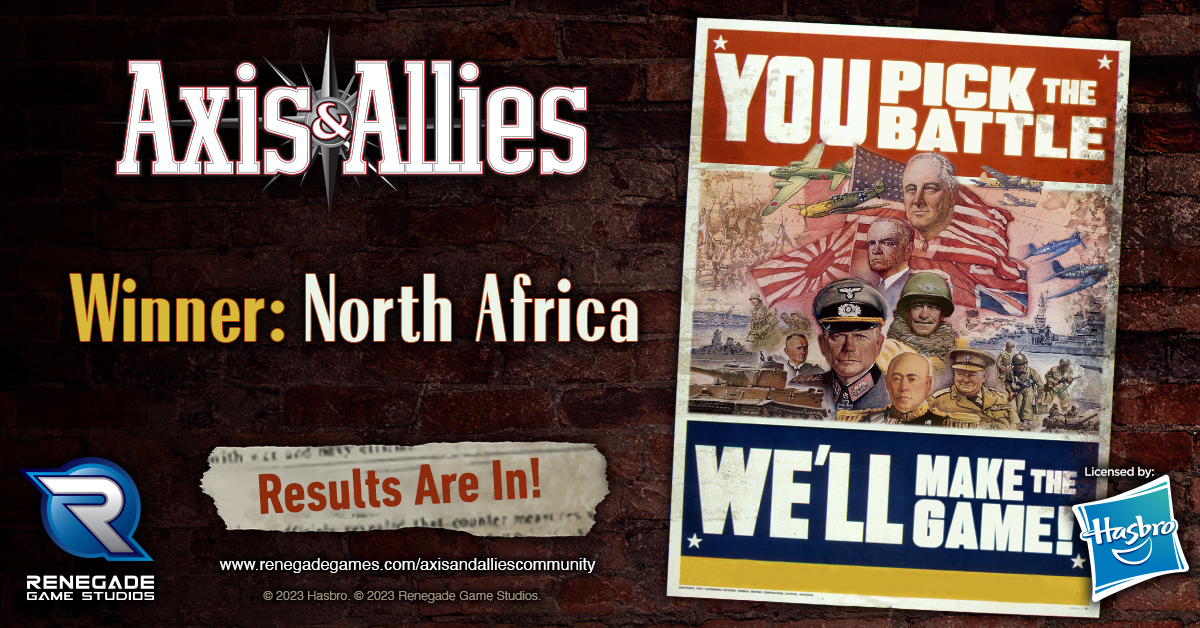 It was a hard-fought campaign for all sides with over 1000 votes, but we're very excited to announce that the North African theatre option has narrowly beaten Operation Market Garden, the Eastern Front, and Stalingrad as the community choice for the next NEW Axis & Allies board game! We'll be taking the fight to the sandy deserts of Egypt, Libya, Morocco, Algeria, and Tunisia next year!