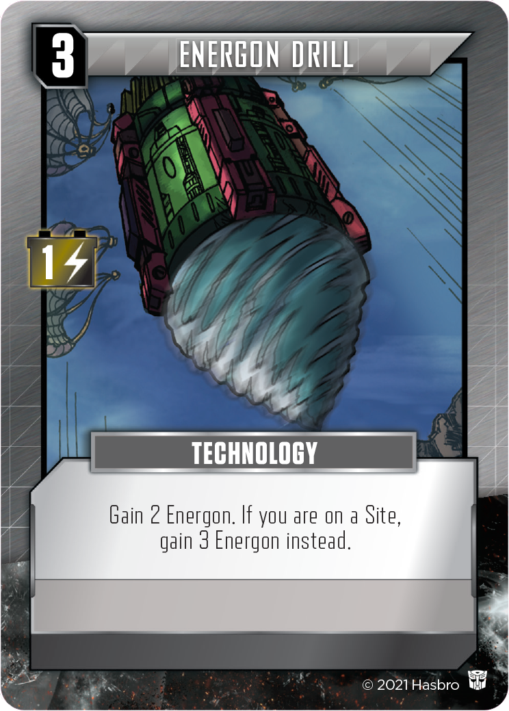 Energon abilities, whether on your Bot mode or other cards in play, can each be activated only once per turn, but can have a host of powerful abilities. It can be very helpful to build up a healthy supply of Energon by visiting sites like “Energon Mine - Small”, or the Technology card, “Energon Drill” to better power these abilities, as well as fueling on-demand changing!