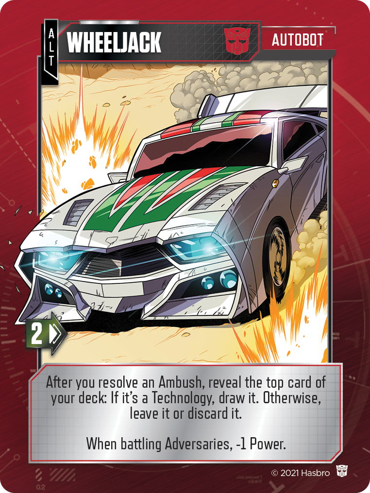 As discussed in the previous article, you’ll begin each play of the Transformers Deck-Building Game by teleporting into the Matrix in your Alt mode, which for Optimus Prime is the infamous big-rig tractor trailer. In the game, Alt mode is optimized for traveling around the Matrix, but for the existing Autobots at least, comes with a penalty when used in combat. Each Autobot has a passive ability while in Alt mode. For example, Wheeljack’s Alt mode ability plays on his love of gadgets and tech, allowing you to reveal the top card of your deck whenever you resolve an ambush. If it’s a technology card, you may draw it, otherwise you’ll have the option to leave it or discard it.