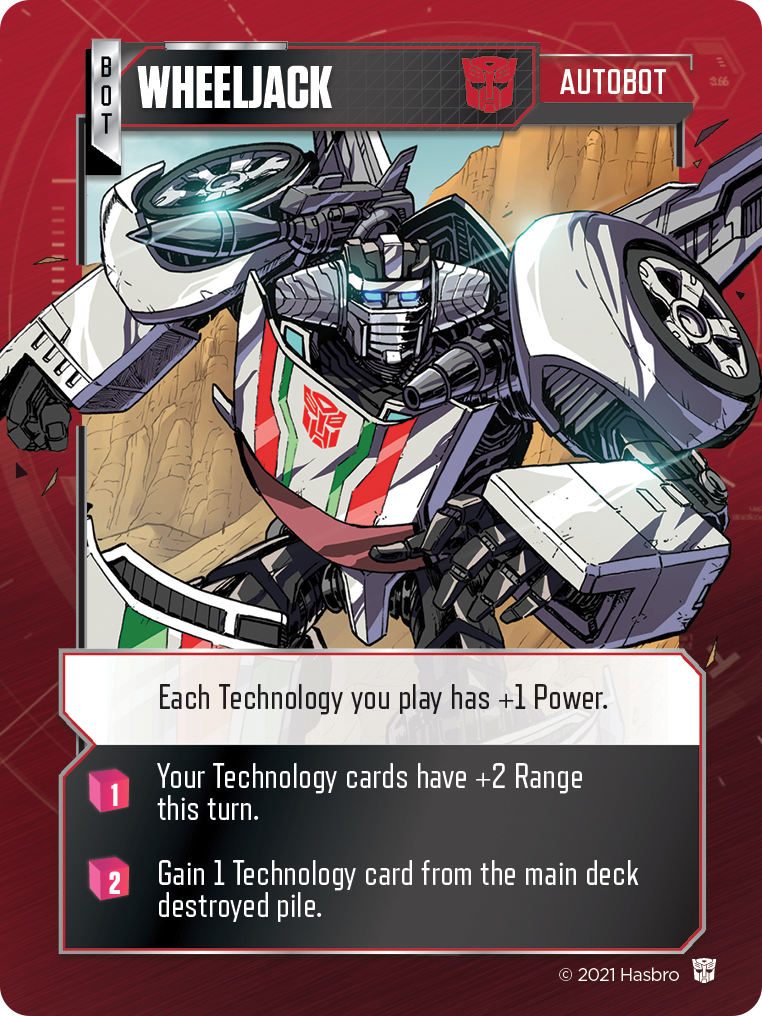 While it’s still possible to battle Decepticons while in your Alt mode, you’ll suffer a -1 power penalty when doing so, so for most battles it’s advisable to use your Bot mode. Bot mode not only suffers no penalty in combat, and has a useful passive ability (similar to those in your Alt mode) but also features 2 Energon abilities that may be triggered by spending the specified amount of Energon. To use tech-loving Wheeljack as an example again, their passive Bot ability is that each Technology card they play has +1 power. Their Energon abilities allow the range of Technology cards to be boosted, or even allow them to gain a powerful Technology from the main deck’s destroyed pile at no additional cost!