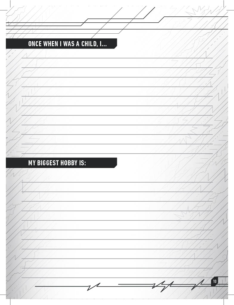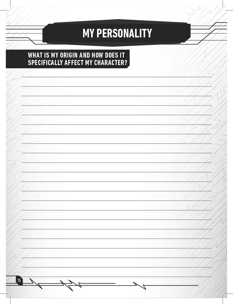 Visual aspects are equally as important as narrative aspects in fully bringing a character to life. With that in mind, the character journal delivers a place to describe exactly how your individual character’s soon-to-be iconic Power Suit appears!