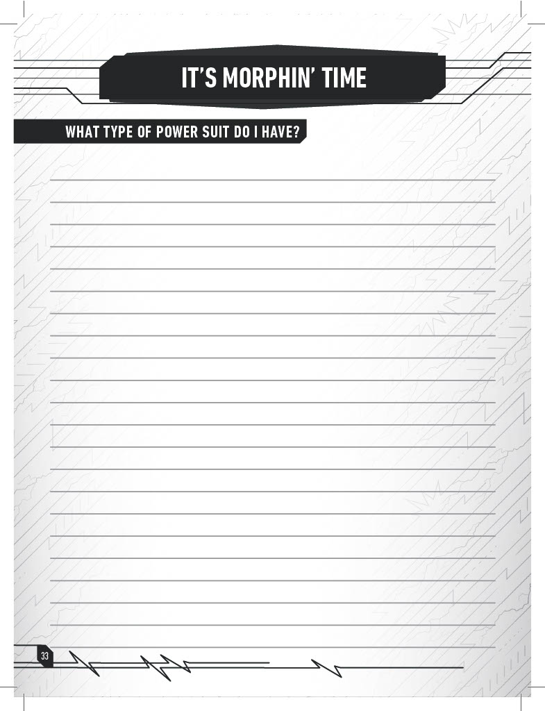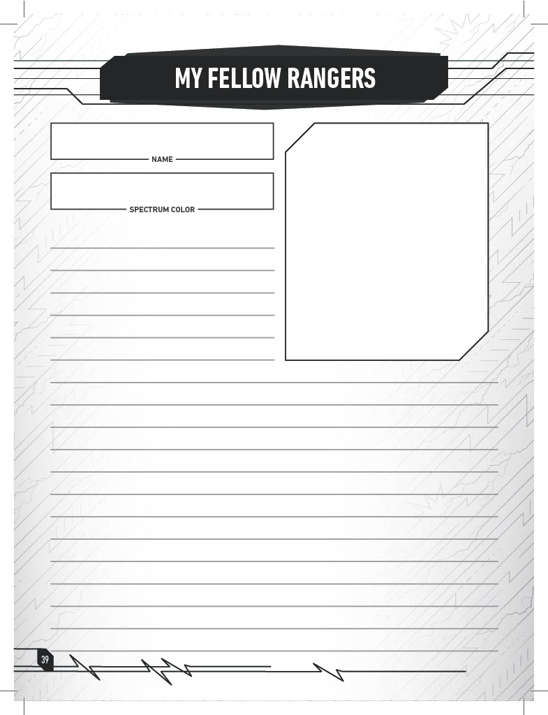The journal also includes an equipment page where you can keep track of and describe all the goodies you acquire throughout your adventures, as well as a section to describe your character’s unique power weapon! The following pages also provide room to describe your Zord, and your team’s Megazord, in full detail!