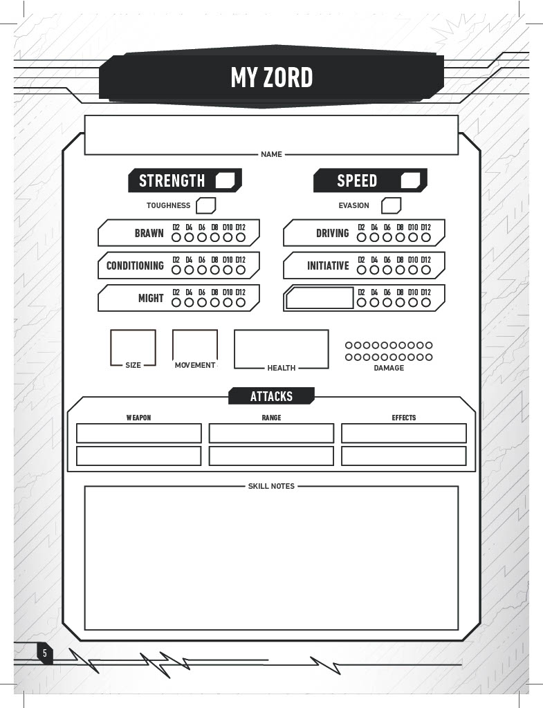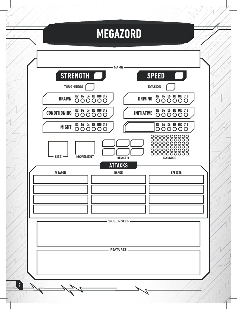 The first eight pages feature expanded character sheets for your ranger, your Zord, and your team’s Megazord! Each character sheet includes room for all necessary stat information, as well as room dedicated to defining the character traits of your ranger, and features of your Zord!