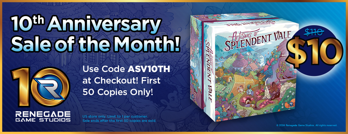Thank you for supporting Renegade throughout the years! As a token of our appreciation, on the 10th of each month, we're running flash sales of some of our favorite Renegade games! These flash sales will offer incredible value, with select titles available for just $10 to the first 50 customers who seize the opportunity.