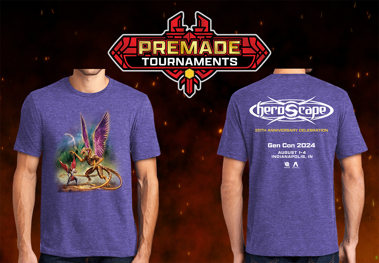 Bring your own Heroscape armies and compete in our premade Heroscape events! All participants will take home a Gen Con 2024 Heroscape T-Shirt (pictured above), and it's exclusive to this event! You can't get it anywhere else! All participants of premade events will also receive a Shiori promo figure.