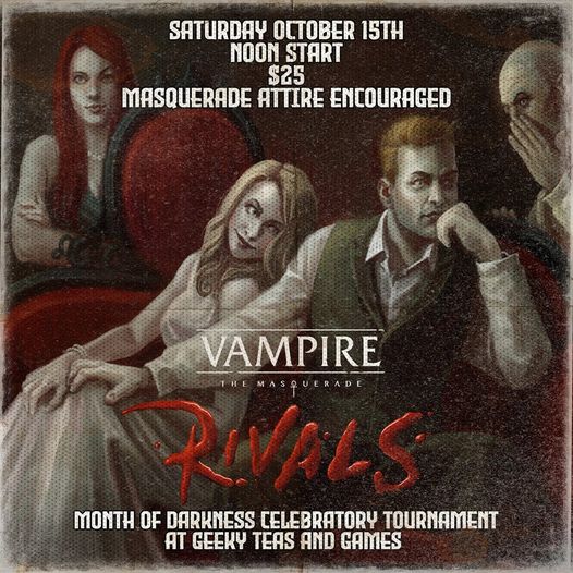 - Vampire: The Masquerade Rivals Tournament - Saturday 12 PM - 8 PM PST at Geeky Teas & Games