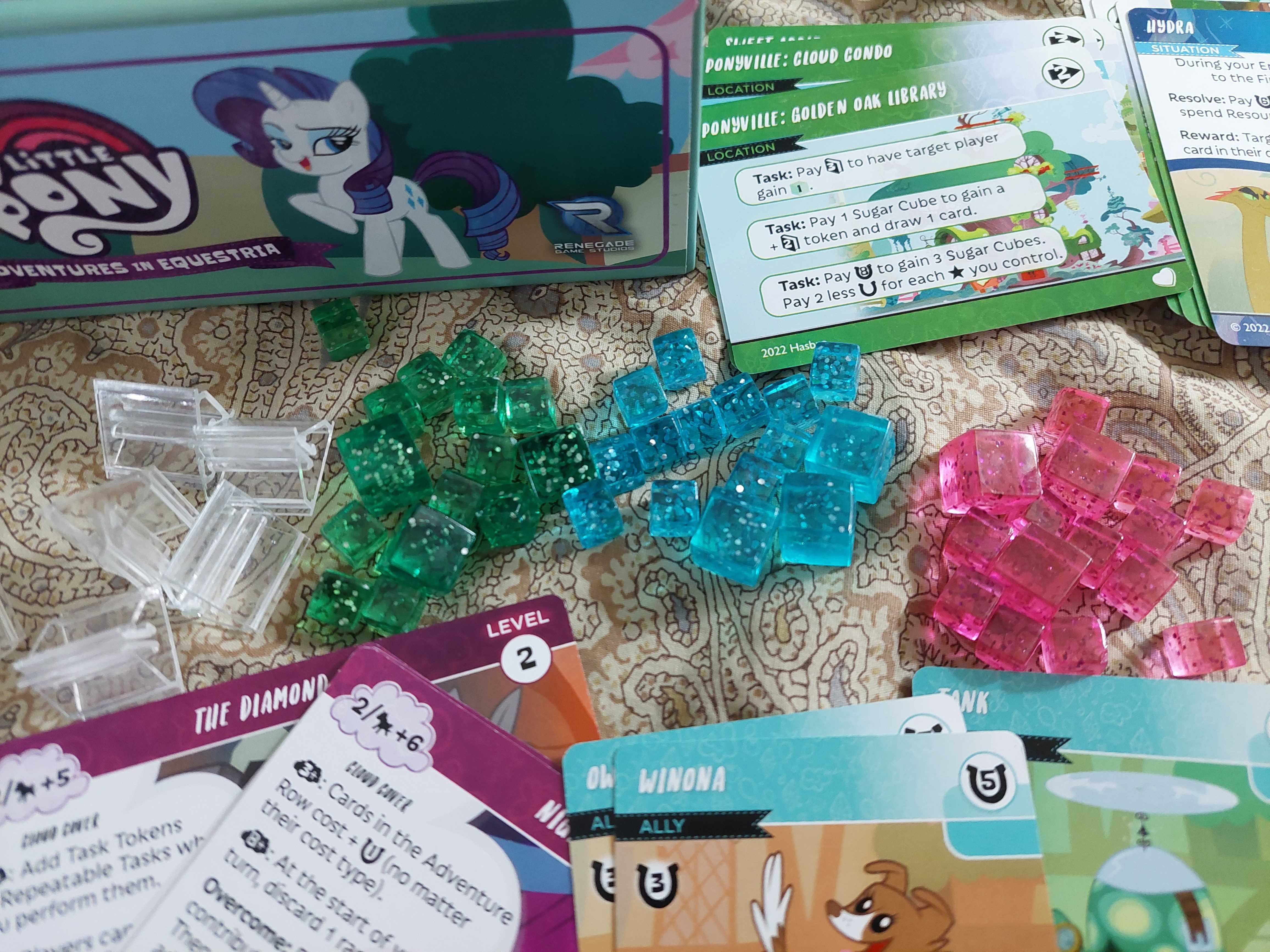 The My Little Pony: Adventures in Equestria Deck-building game is a co-operative card game for 1-4 players, where your goal is to build your deck with cool cards and collect Sugar Cubes along the way before these nasty Clouds put a damper on your efforts. Once Clouds start accumulating quickly, it could spell the end of the game! You will have to endure the calamity of Situations, Hurdles, and a Final Challenge; so show this hardship the magical power of friendship!