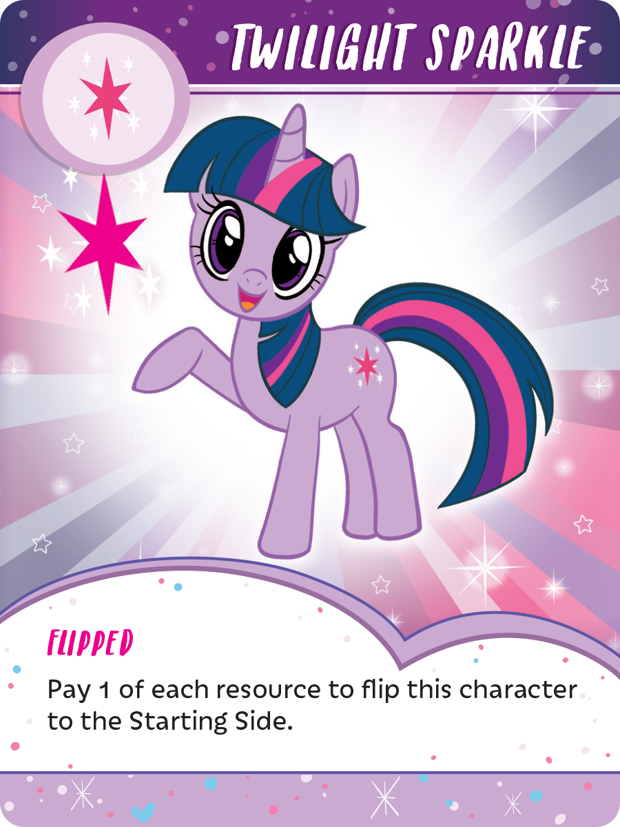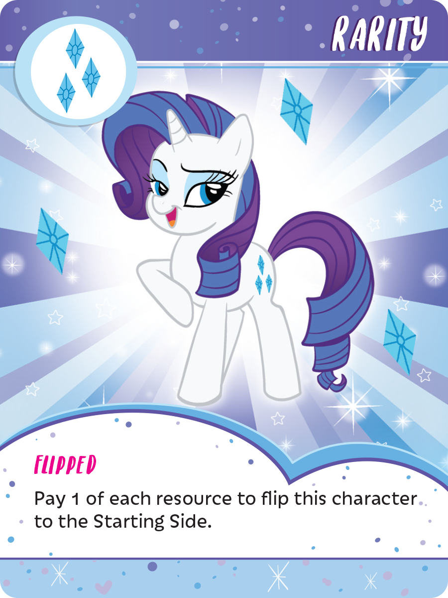 Each character card has the same text on its Flipped side: Pay 1 of each resource to flip this character to the Starting Side. You can perform this ability once per turn as well. So, in essence, you could set yourself up with a really good turn: perform your Starting side ability, generate your resources from your cards, then perform your Flipped side ability from the resources you’ve just generated! It’s like performing a Sonic Rainboom! Okay, it's maybe not quite as exciting as a Sonic Rainboom.