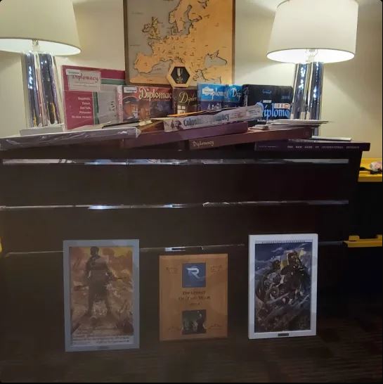 Robert Lacy is a deserving awardee for “Diplomat of the Year”. As part of his award, he was provided with a giant plaque commemorating the honor as well as a Diplodocus award. The Diplodocus awards were originally conceived by Allan Calhamer as a means to honor the written contributions to Diplomacy Zines. Only a few remain in circulation and I’m sure Mr. Calhamer would be proud of the effort Robert has put into growing this great game her created. We congratulate Robert on the honor and look forward to playing with him on the board next year. If you want to get into contact with him, please reach out in the Diplomacy thread on Renegade Game Studios official Discord at https://discord.gg/R6323FMp.