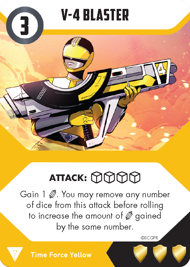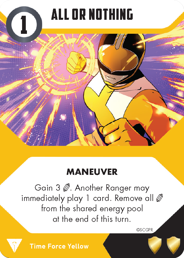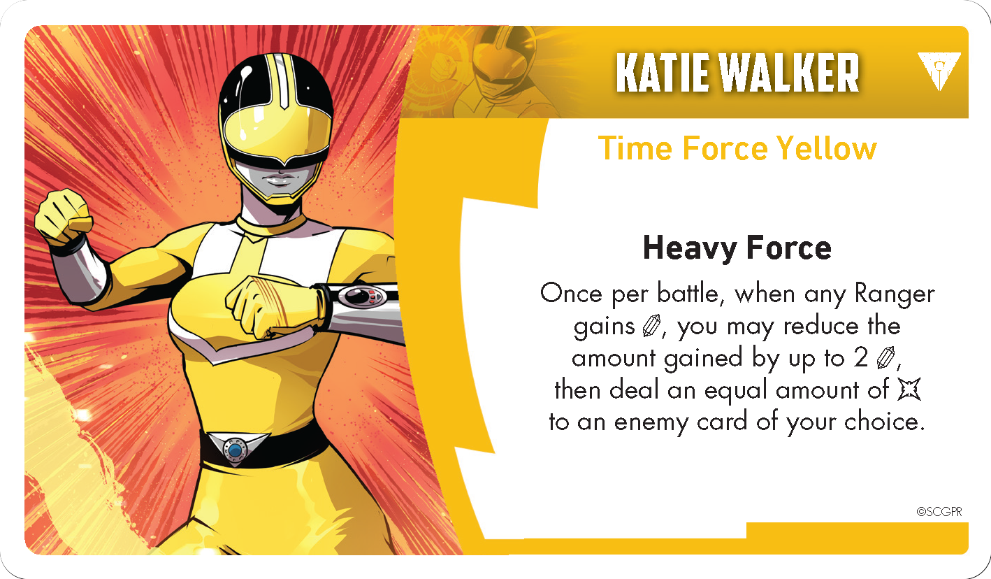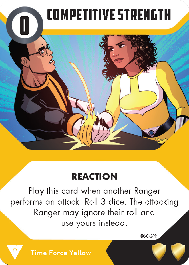 Part of maintaining your strength is staying motivated, (just ask the Quantum Ranger). And Katie’s card, Competitive Strength, lets her show the other Rangers how it’s done! Unlike a normal re-roll effect you may choose which dice pool to use for the attack. In addition you can use this card to boost up low-dice attacks with the dice from her roll!