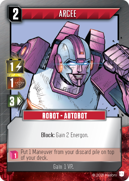 One of the three main resources in this game is Move, which is indicated by a green arrow. These arrows can be found primarily on non-Damage Basic cards, a few of the Starter cards, Robot and Maneuver cards, and the Alt Mode side of the Character cards. They may also occasionally show up in a few other places, but those are rarer. The number on the arrow icon indicates how many "Move points" are generated by that card when played (or present at the start of each turn in the case of Move on Character cards).