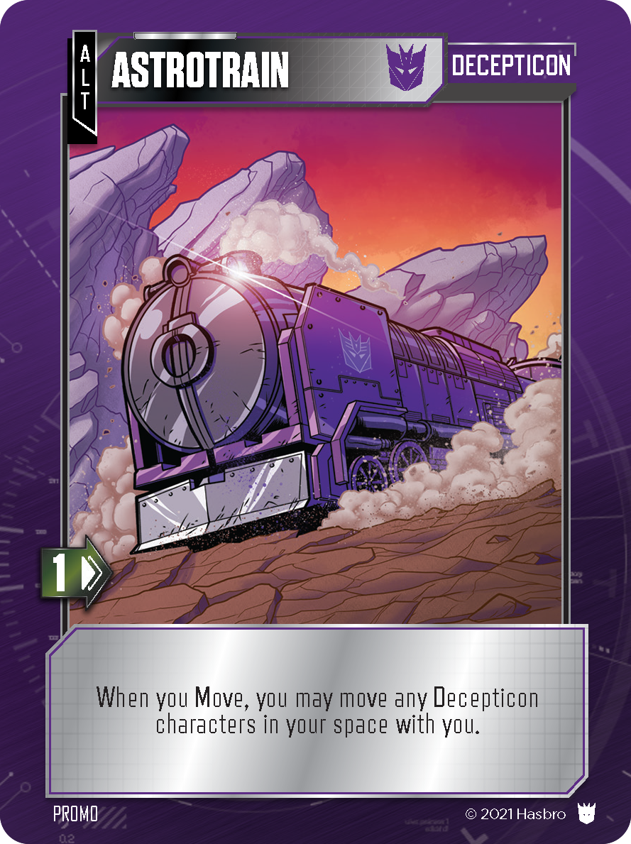 With the introduction of Astrotrain as a playable character in Promo Pack #2, we find our first glimpse into the world of multi-changers, and with them, an additional rule regarding Move. Multi-changers are Transformers with more than one Alt Mode. When Converting, a multi-changer can choose to change to any of their different modes. It's possible that multiple modes may have Move values on their card, and they may even have different Move values. For example, Astrotrain has 1 Move in his train Alt Mode and 2 Move in his shuttle Alt Mode. If a player Converts between modes several times in the same turn, the Move on the mode's card does not reset. That is, any Move spent in one mode also decreases the Move value in other modes. Again, using Astrotrain as an example, if he starts in train mode and spends the 1 Move, then Converts into shuttle mode, he will have 1 Move remaining to spend. Alternatively, if he starts in shuttle mode and spends 1 or 2 Move, but then Converts into train mode, then he will have no more Move while in that mode, and will have to Convert back to shuttle mode if he wants to access the remaining 1 Move this turn. The same as other characters, all Move does reset at the end of your turn.