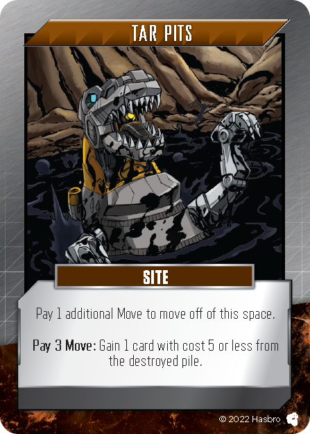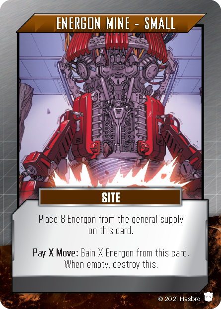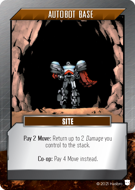 When a player's character is on a facedown card, they may spend one Move to Search that space, which turns the card in that space faceup. If this is an Adversary, it will trigger an Ambush as we saw last time. Some cards, such as Sites, allow players to spend Move while in that space in order to activate an effect. For example, Autobot Base allows a player to pay 2 Move to get rid of Damage, and Energon Mine - Small allows them to pay any amount of Move to claim the same amount of Energon from the Site.