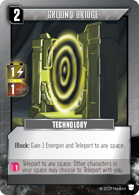 There are yet other Cybertronians who use technology or inherent abilities to travel instantaneously. In this game, this is represented by the term Teleport. Teleport allows a character to move without spending Move. It is a special, free type of move ability that is separate from any Move granted on the card by way of the arrow icon. A Teleport ability may have a value listed, which indicates how many orthogonal spaces away the character can move. If a value is not listed, then the character may Teleport to any space in the Matrix (it may also state this explicitly). For example, Mirage can Teleport one space when Blocking, but Skywarp can Teleport to any space, though if defeated by an Autobot instead of purchased by a Decepticon, the victorious Autobot may Teleport 1 space as a reward. One really powerful benefit of Teleport abilities is that Teleporting onto an Adversary's space does not incur an Ambush; however, since it is still technically a type of move, any other game effect that triggers when moving to a space will still apply when Teleporting, eg: if a card, such as Tar Pits, requires extra Move to enter its space, Teleporting there would mean the standard move to that space has no cost, but the extra penalty cost must still be paid.