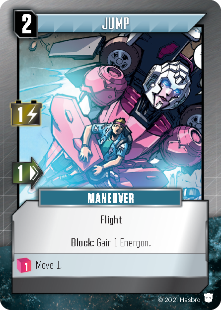 But clearly there are Cybertronians who are not wheeled vehicles, nor do they travel on the land. What about Transformers who appear on Character or Robot cards like Starscream or Jetfire? Are they restricted to orthogonal movement? And are there any other ways around this? The answers are technically yes, and yes! For these situations, there is the Flight keyword. Cards which have the Flight keyword, such as Jetfire (Robot), Starscream (Robot or Character), or Jump (Maneuver), are able to use the Move on that card to travel diagonally; that is, 1 Move can allow the player's character to move 1 space orthogonally OR diagonally. It's important to restate that this keyword, and its associated diagonal movement, only applies to the Move value on the same card. In other words, it does not grant diagonal movement to any other Move you may have from other sources. This is another reason why it is important to track the sources of used Move by using the -1 Move tokens. Flight is much more prevalent in the A Rising Darkness standalone expansion.